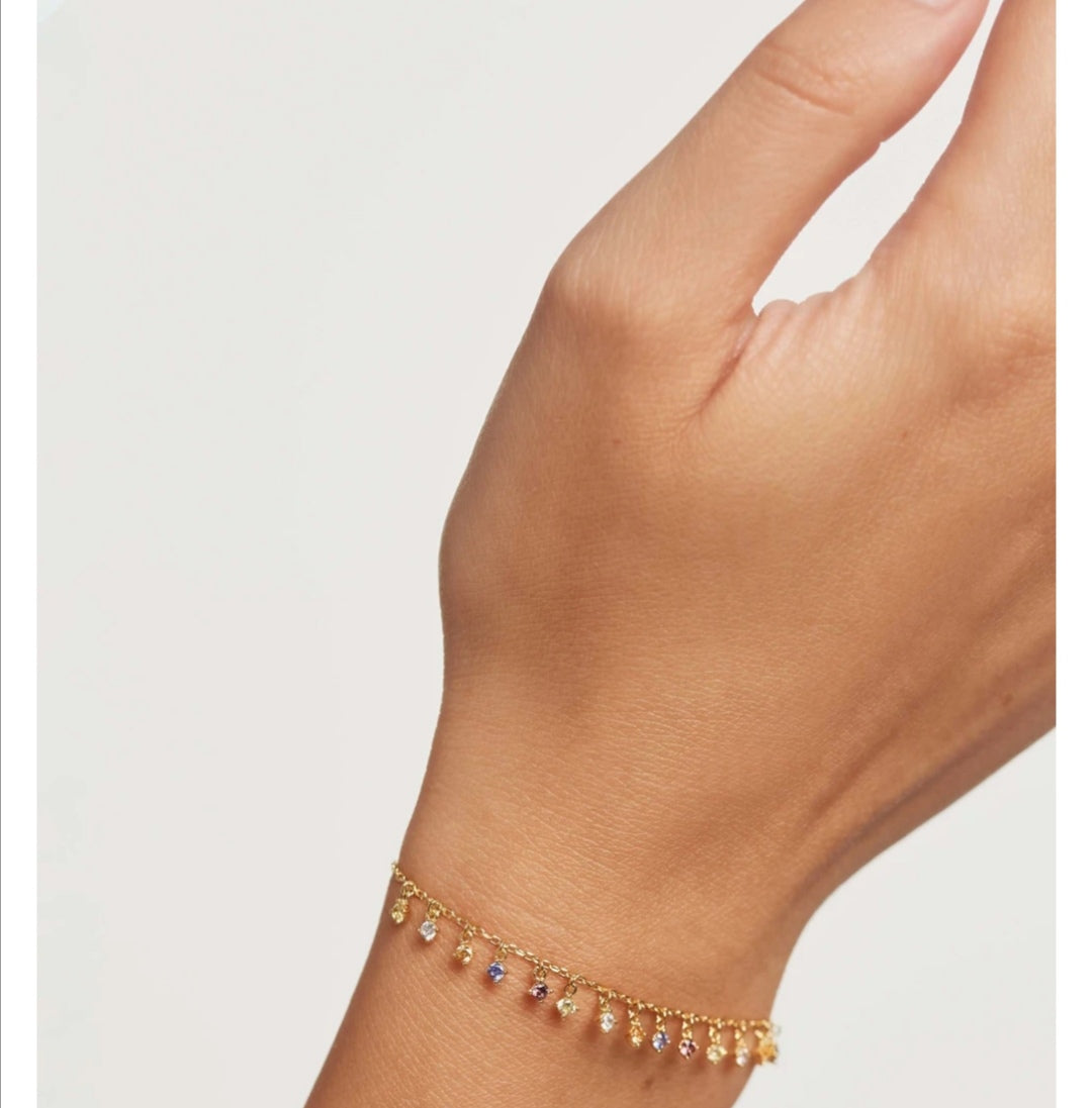 This design features five protagonists, the five colored stones that embellish it. 925 sterling silver with an 18k gold plating combine with sapphire blue toned corundum, rhodolite, golden yellow, pure white and champagne shades that transform the piece into a delicate jewel, symbolizing the innate beauty of nature.