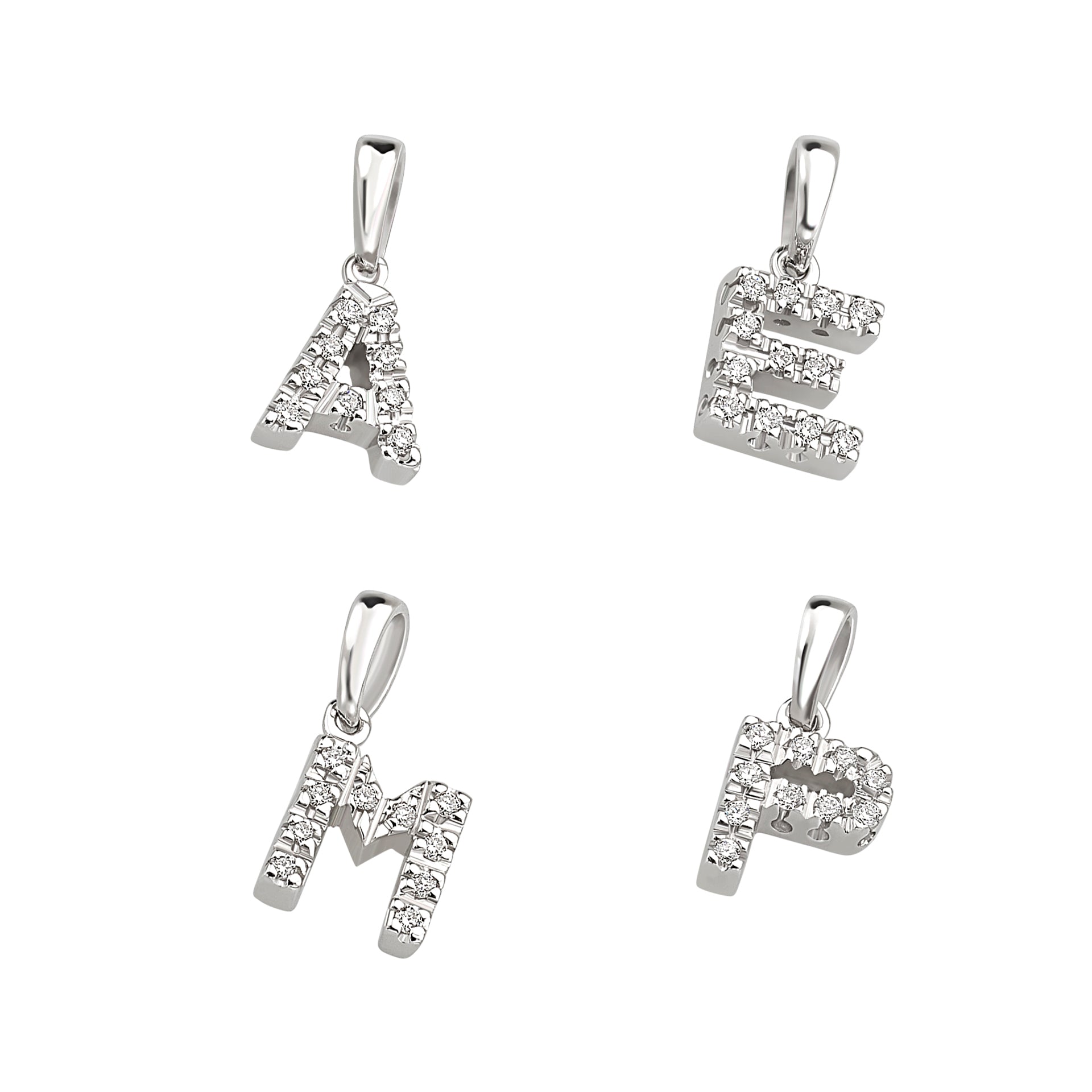 Ciondolo iniziale in oro bianco e diamanti taglio brillante.