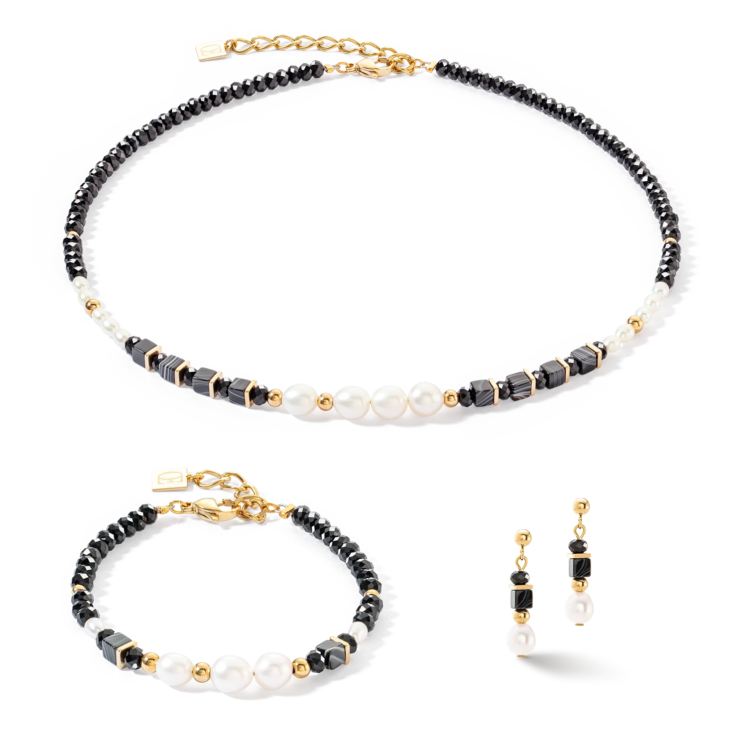 Collana Pearls & Onyx - Ridefinizione dell'eleganza Art Déco Questa collana combina l'affascinante stile Art Déco con un'estetica moderna e sofisticata. Accentuate da elementi dorati, le delicate perle ovali d'acqua dolce incontrano i sorprendenti cubi di onice a righe, la cui forma geometrica forma un netto contrasto con le morbide curve delle perle. Le scintillanti perle di cristallo nero catturano la luce a ogni movimento e creano un sottile fascino. Questa collana irradia eleganza senza tempo e raffinatezza. Da indossare con un elegante abito da sera o come elemento di spicco di un outfit moderno, la collana Pearls & Onyx è un gioiello versatile che unisce senza sforzo la bellezza classica al design contemporaneo.